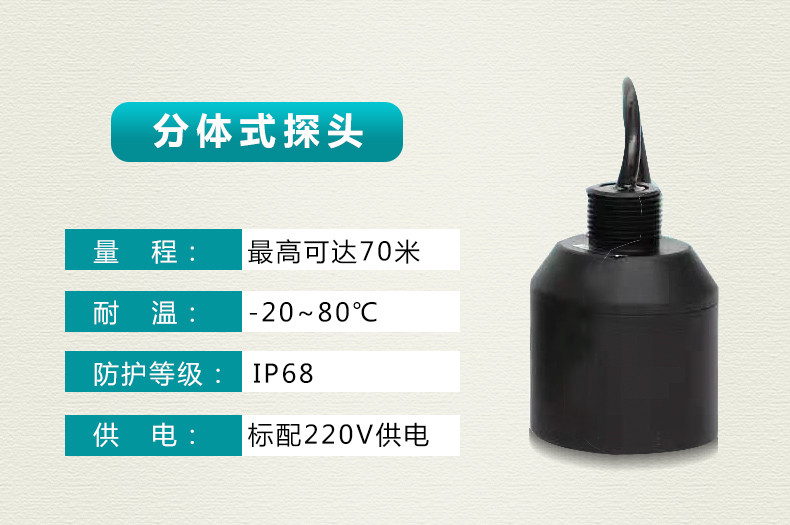 另外,本產品選用**超聲波小角度探頭,發射功率大,靈敏度高,壽命長,測量距離遠;任意點上下限設定,倒值設定。可用于以對蒸汽、灰塵、濕氣的干擾自動補償,除可應用于液體/固體、還可用于不間斷料/液位控制,罐、貯槽、不間斷料/液位測量貯藏室、糧倉等。