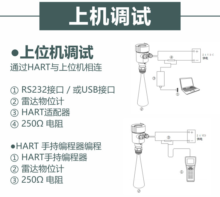 使用軟件調試的時候,給雷達儀表加電24VDC,同時在連接HART適配器前端加一個250歐姆的電阻。如果一體式HART電阻(內部電阻250歐姆)的供電儀表,就不需要附加外部電阻,HART適配器可以和4…20mA線并聯(lián)。