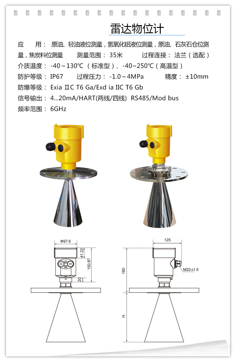 雷達適用于對液體、漿料及顆粒料的物位進行非接觸式連續測量,適用于溫度、壓力變化大;有惰性氣體及揮發存在的場合。采用微波脈沖的測量方法,并可在工業頻率波段范圍內正常工作。波束能量較低,可安裝于各種金屬、非金屬容器或管道內,對人體及環境均無傷害。