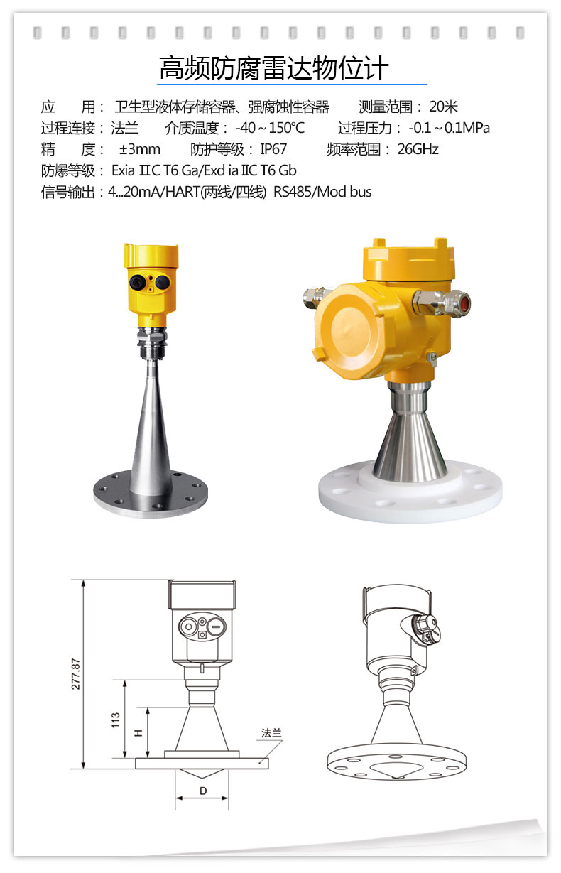 雷達適用于對液體、漿料及顆粒料的物位進行非接觸式連續測量,和溫度、壓力變化大,有惰性氣體及揮發存在的場合。采用微波脈沖的測量方法,并可在工業頻率波段范圍內正常工作。波束能量較低,可安裝于各種金屬、非金屬容器或管道內,對人體及環境均無損害。
