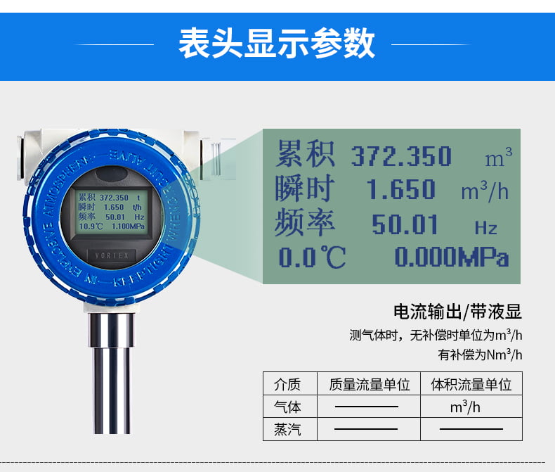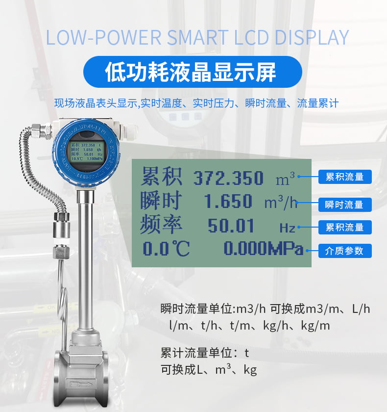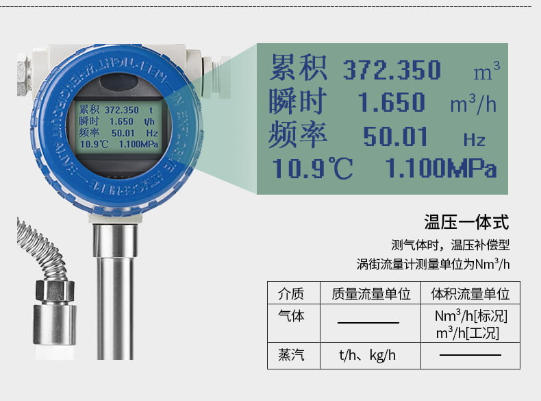 溫壓補償一體式渦街流量計具有現場液晶表頭顯示,實時溫度、實時壓力、瞬時流量、累積流量,有溫度、壓力補償功能,在測量氣體、蒸汽時,根據實測溫度、壓力進行查表方式補償,保證流量不受溫度、壓力變化,引起汽體密度的變化而影響流量計準確性。