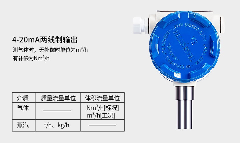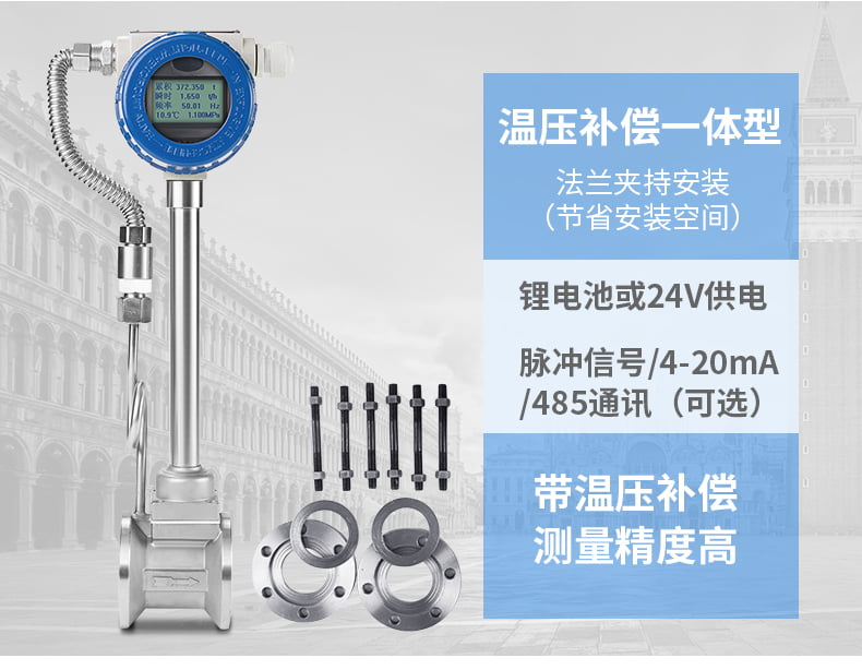 8、測量體積流量時不需補償,渦街輸出的信號實際上是與流速成線性關系的,也就是與體積流量成正比。壓力和溫度補償的目的是為了得到流體的密度,乘以體積流量就得到質量流量,若測量氣體的體積流量就不需要補償。