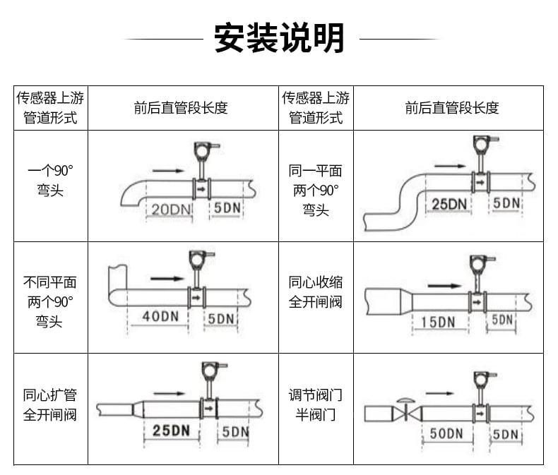 渦街流量計上游的應有至少10D長度的計量直管段。直管段內壁應光滑、更不能有臺階,磨平連接法蘭的焊縫,法蘭墊片不能突入管道內。更不能把流量計的安裝方向裝反了。試驗證明:一切不合理的安裝,都將導致流量計計量值偏低。