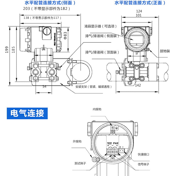 3、被測介質不允許結冰,否則將損傷傳感器元件隔離膜片,導致變送器損壞,必要時需對變送器進行溫度保護,以防結冰;
