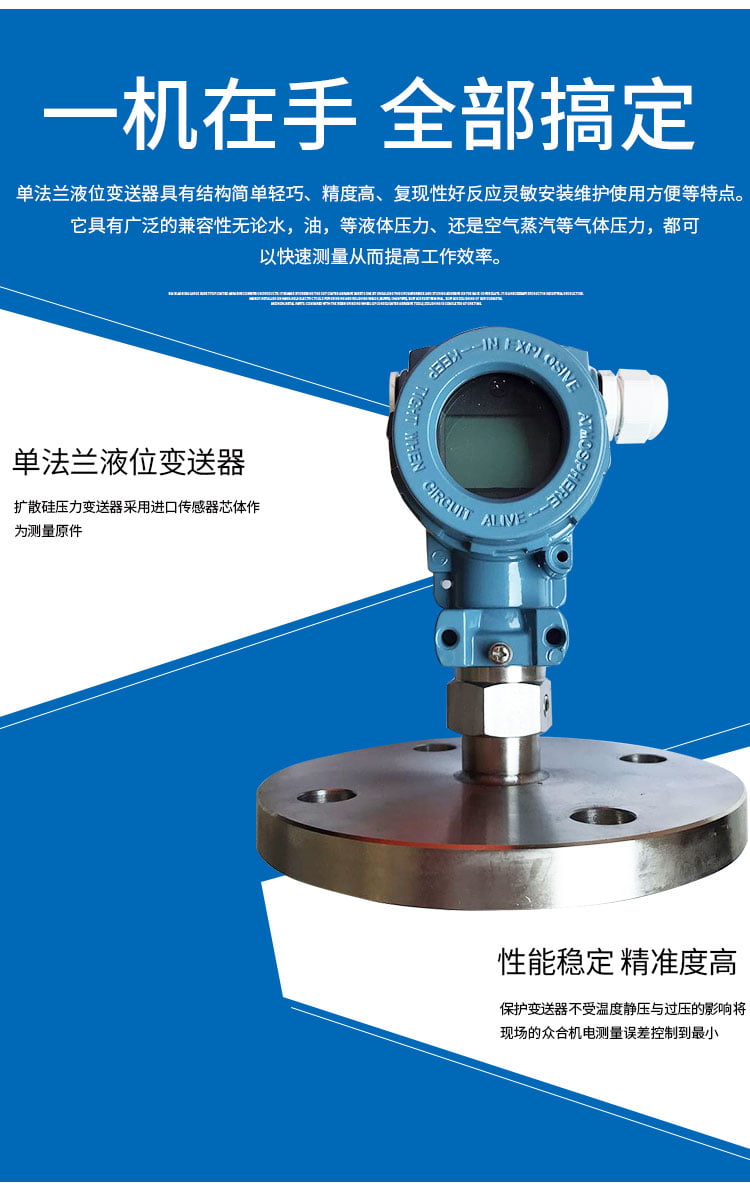 單法蘭液位計是對壓力變送器技術的延伸和發展,根據不同比重的液體在不同高度所產生壓力成線性關系的原理,實現對水、油及糊狀物的體積、液高、重量的準確測量和傳送。