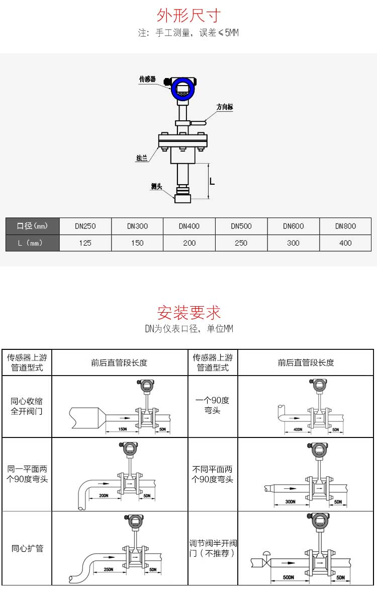 4.保證流量計(jì)前有大于15D和后有5D的直管段(D為管道內(nèi)徑)。