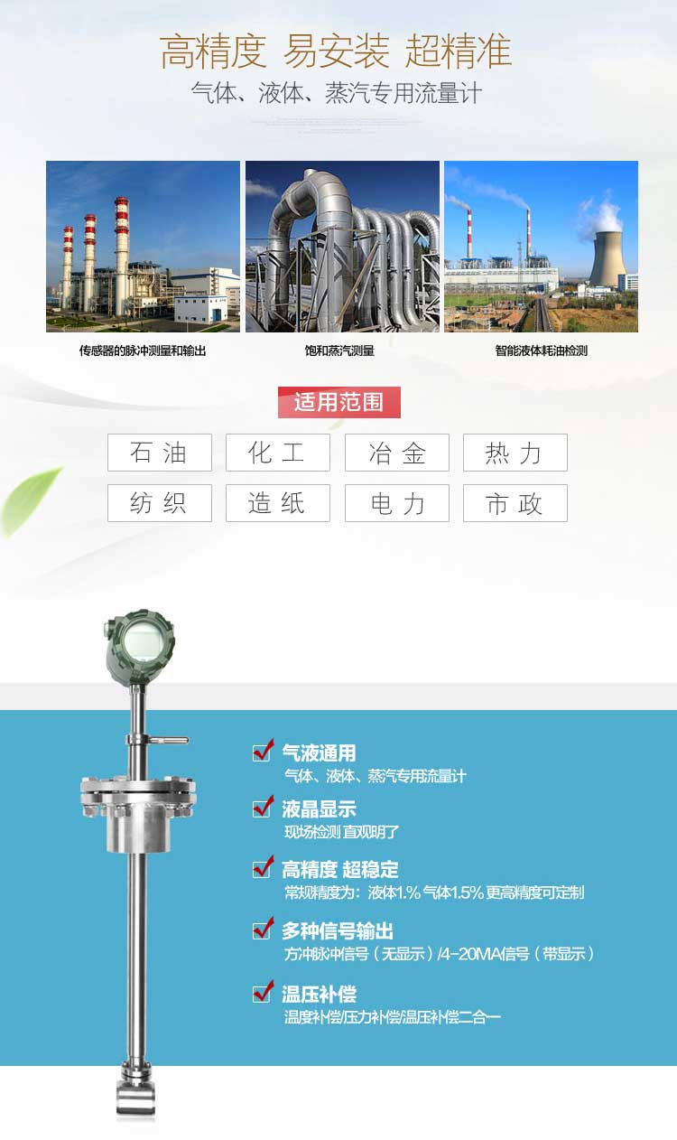 渦街流量計(jì)**適用于石油、化工、冶金、熱力、紡織、造紙等行業(yè)對(duì)過熱蒸汽、飽和蒸汽、壓縮空氣和一般氣體(氧氣、氮?dú)鈿錃狻⑻烊粴狻⒚簹獾龋?、水和液體(如:水、汽油、酒精、苯類等)的計(jì)量和控制。