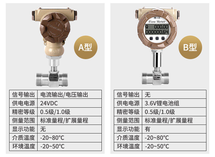 ZW-LWGY-B型:智能現場顯示。說明:雙排液晶表頭,現場同時顯示瞬時流量和累積流量,鋰電池供電,電池電量可連續使用三年以上,無信號輸出。標配為防爆型產品(ExdIIBT6,防爆證號:CE061580)。