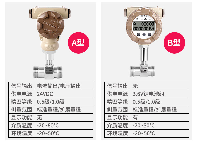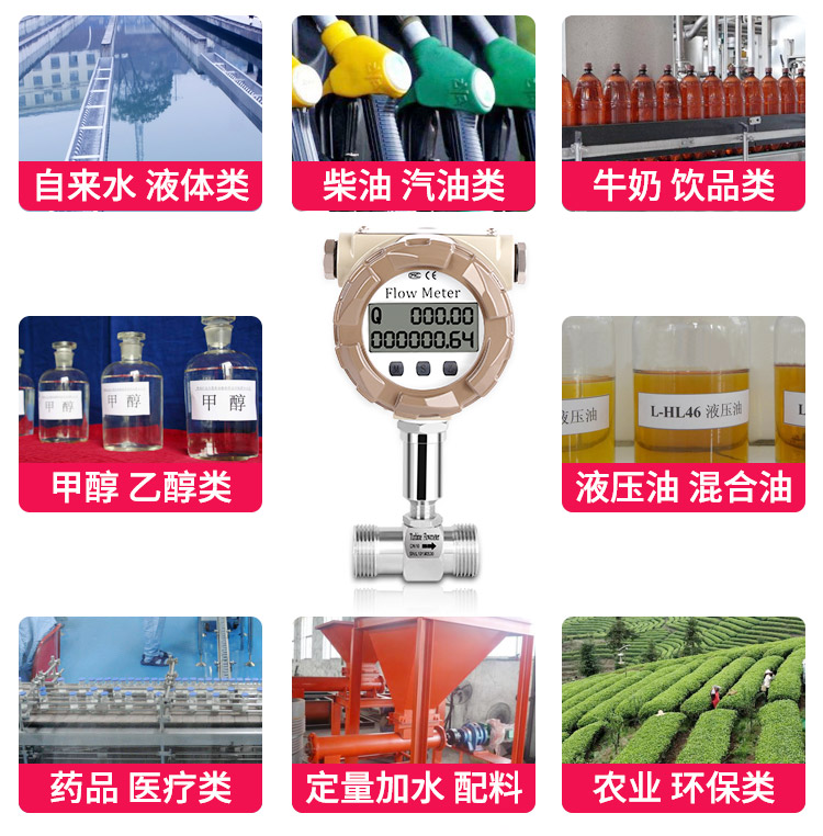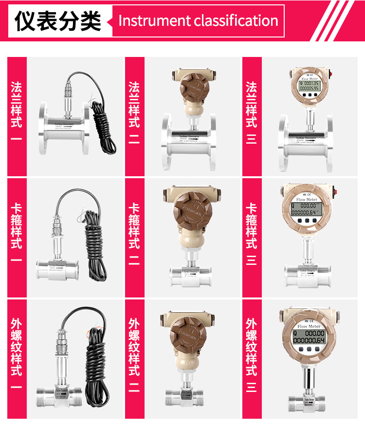 8、型流量計類型多,例如卡箍式衛生級渦輪流量計、超低溫型渦輪流量計(zui低可達-253度)、全塑料結構渦輪流量計、雙向測量型渦輪流量計、高壓液壓油渦輪流量計、油田井下型渦輪流量計測量儀、全防腐蝕型渦輪流量計等;