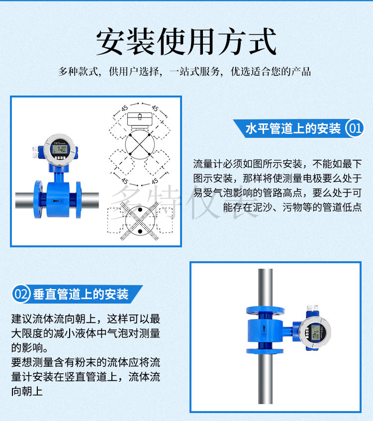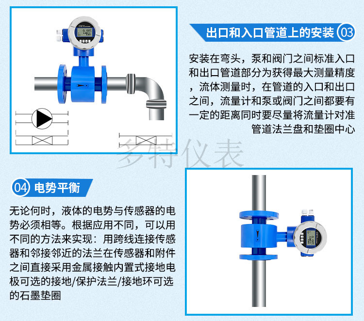 3、流量計前方zui少要有5* D(D為流量計內徑)長度的直管段,后方zui少要有3* D(D為流量計內徑)長度的直管段;