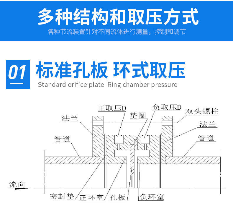 屬標準孔板。當管徑在400毫米以上時,多采用此種形式。取壓方式為法蘭單獨鉆孔取壓、圓形均壓環取壓或方形均壓環取壓。孔板形式可為帶柄孔或非標準的圓缺孔板等。