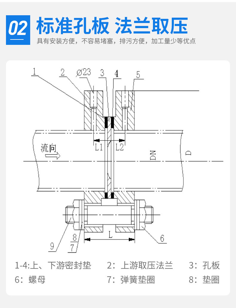 屬標準孔板。取壓方式為管道取壓。上游取壓孔中心位于孔板前面一倍管道內徑處。下游取壓孔中心位于距離孔板后端面為管內徑之半的地方。