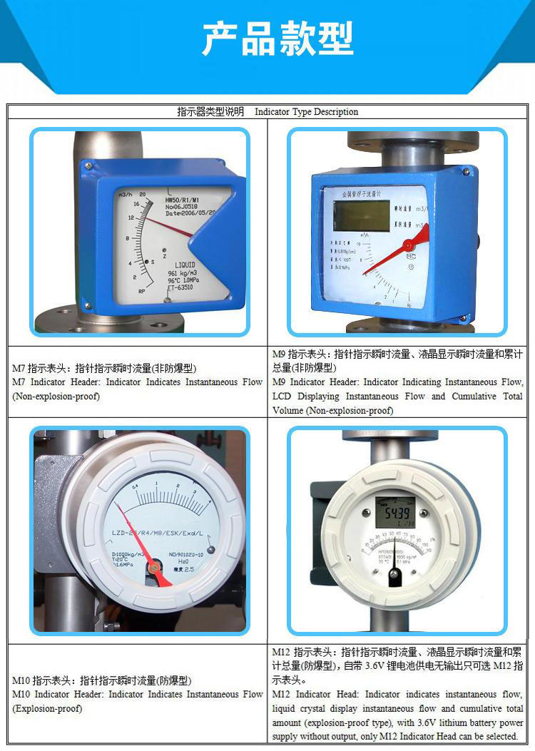 1、就地顯示型:由就地指示器中的隨動磁鋼與浮子內磁鋼耦合,而發生轉動,同時電動指針通過刻度盤指示出此時流量