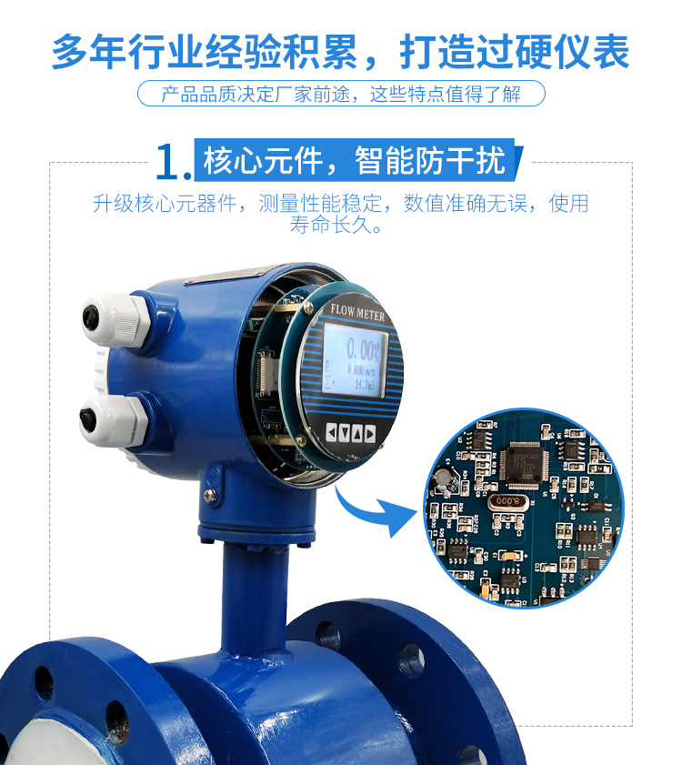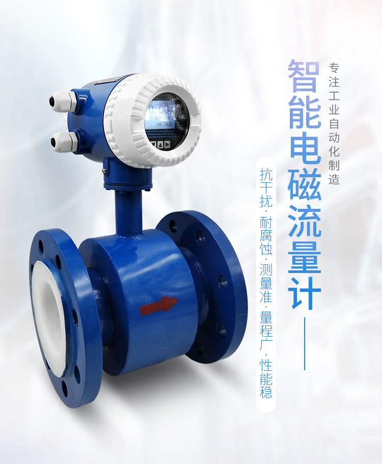 智能防腐型電磁流量計由傳感器和轉換器組成,傳感器安裝在測量管道上,轉換器可以與傳感器組合連接在一起稱為一體型電磁流量計,轉換器被安裝在離傳感器30米內或100米內的場合,兩者間由屏蔽電纜連接稱為分離型電磁流計。傳感器主要組成部分是:測量管、電極、勵磁線圈、鐵芯與磁軛殼體。