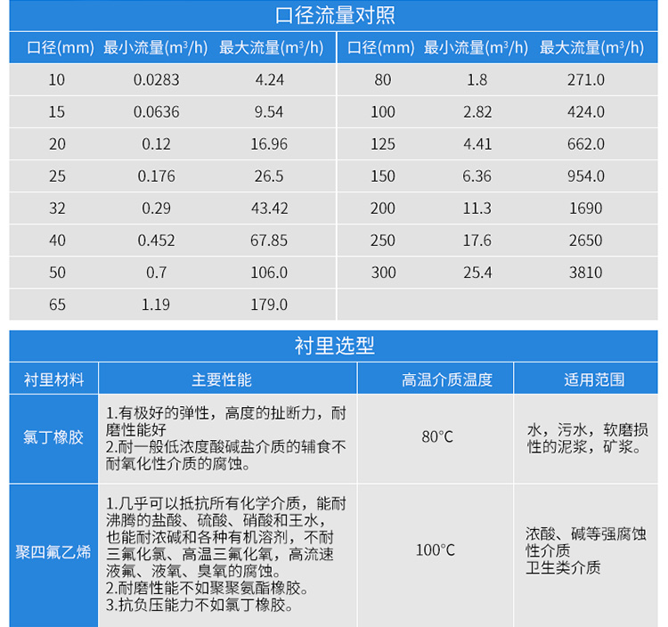 6、介質溫度:聚四氟乙烯襯里≤180℃;橡膠材質襯里≤65℃。