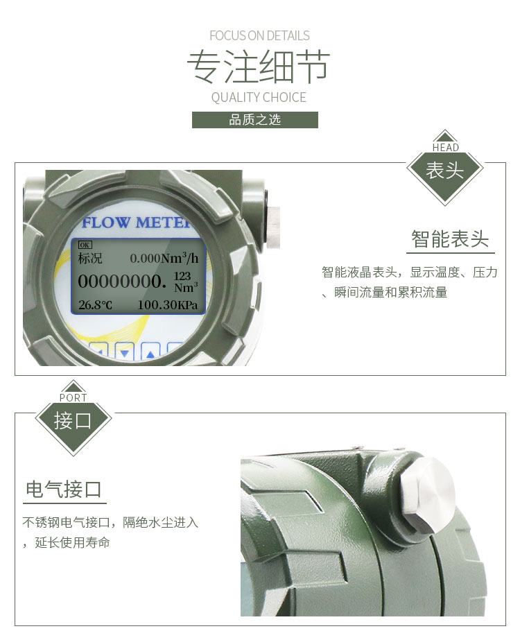 智能旋進旋渦氣體流量計是采用**的雙探頭旋進式流量傳感器技術,抗干擾能力強,精確度高、無機械轉動部件,不易腐蝕,結構緊湊,可靠性高、穩定性好,維修量小。,具有功能強,流量范圍寬,操作維修簡單,安裝使用方便等優點,由于它的獨特性,使得其在發展過程中必須不斷的適應機械制造水平的發展,主要技術指標達到國外同類產品的**水平的新型氣體流量儀表。