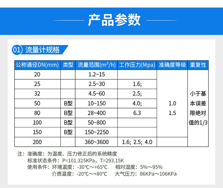 注:a、表中所列的流量范圍為產品出廠時檢定的流量范圍(常溫、常壓下介質為空氣P=1.205Kg/m3);b、隨著壓力的增大,流量范圍也隨之擴大。