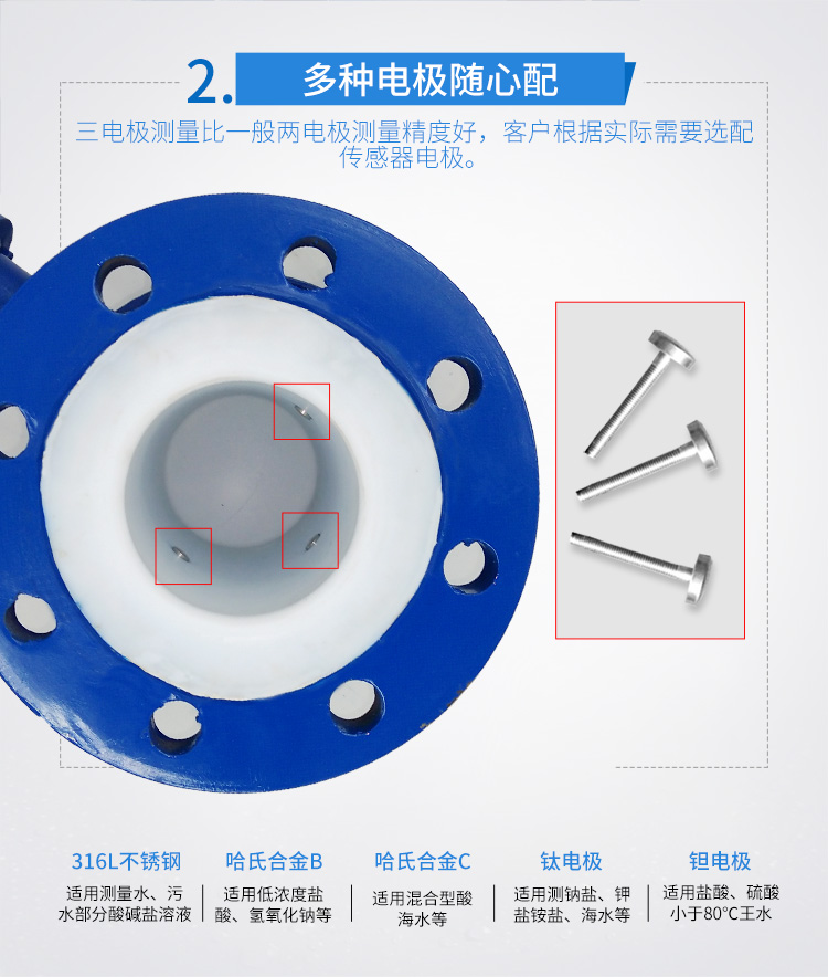 5、采用聚四氟乙烯或橡膠材質襯里和Hc、Hb、316L、Ti等電極材料的不同組合可適應不同介質的需要;