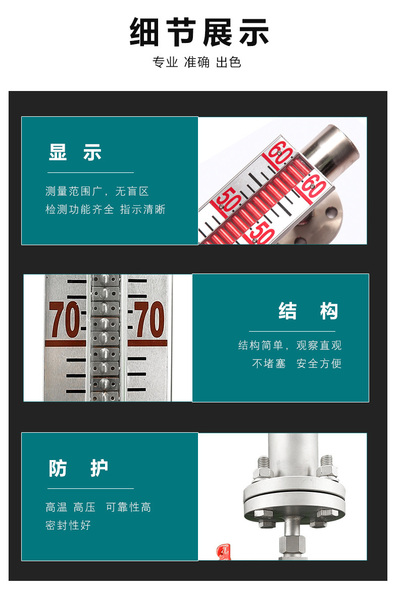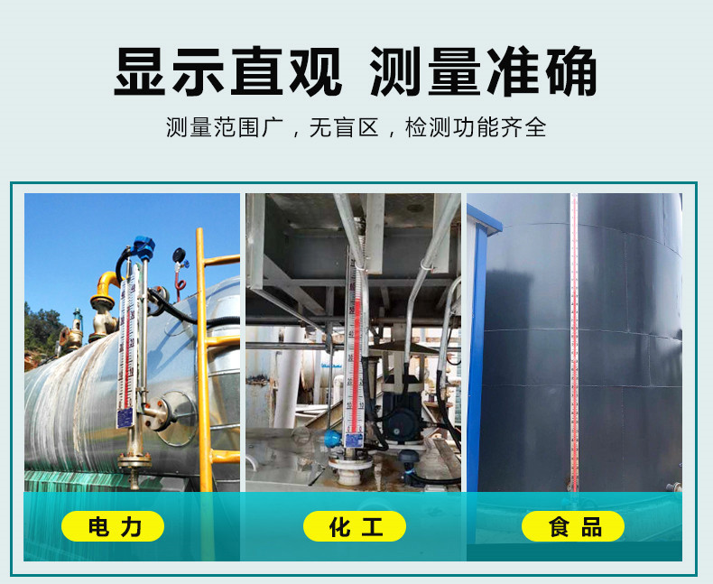 液位計具有就地顯示的直讀式特性,不需要多組液位計組合,可以單體進行全量程測量。設備擁有開孔少,顯示清晰,標志醒目,讀數直觀等優點。當液位計直接配帶顯示儀時可省去該系統信號檢測的中間變送從而提高其傳輸精度。
