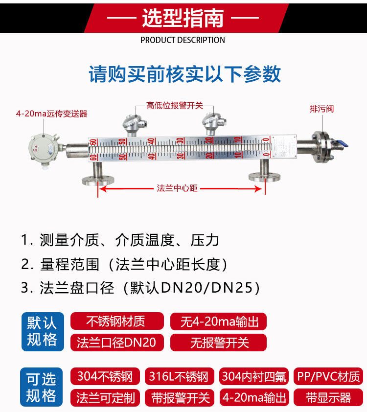 7、各型號均可選配4-20mADC液位變送器,實現遠距離集中測量與控制。